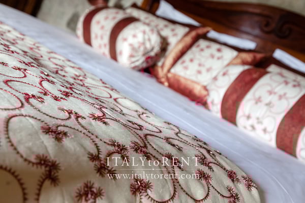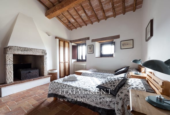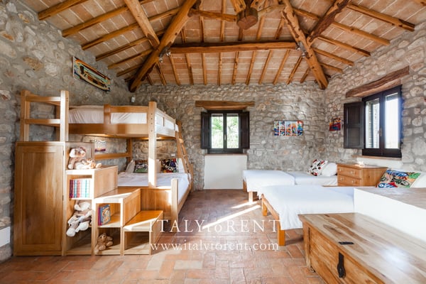 • Set in a tower that is very characteristic in this area of Umbria, accessed from the first floor hallway there are 14 steps leading up to this stone walled room with a beautiful vaulted chestnut wood beamed ceiling and with windows on all sides. Large air-conditioned bedroom (25sqm), ideal for kids with 2 single (90x190cm joinable) beds and an oak bunk bed with large mattresses (lower 150x200cm, upper 100x200cm). Also suitable for adults given the architectural interest and stunning views.