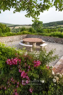 A ruined country house (also belonging to Tenuta Pulceria) is visible from the pool. This area is separated by a fence from the pool area and the rest of the garden for security reasons.