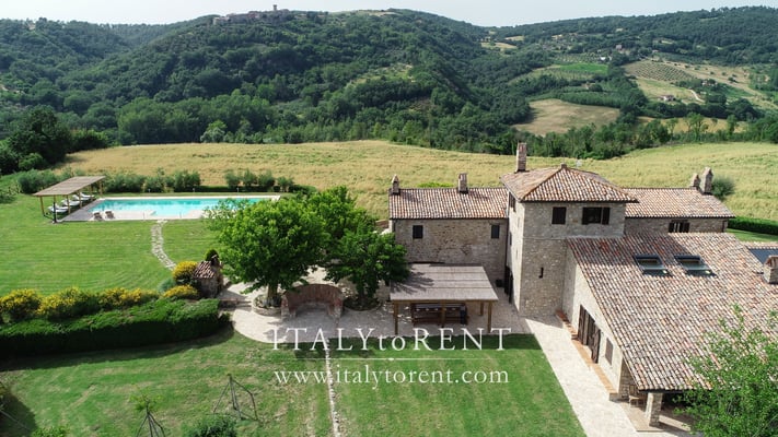 The property is set in private commanding location with 360 degree views over the Umbrian hills and the nearby hilltop village of Camerata, with its stone houses and battlemented church tower.