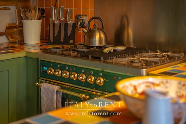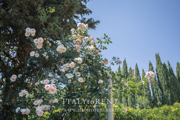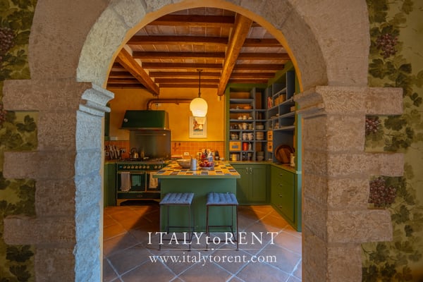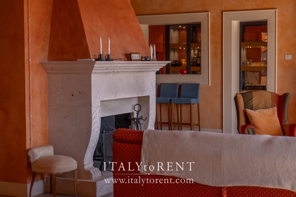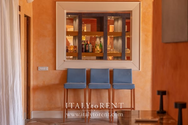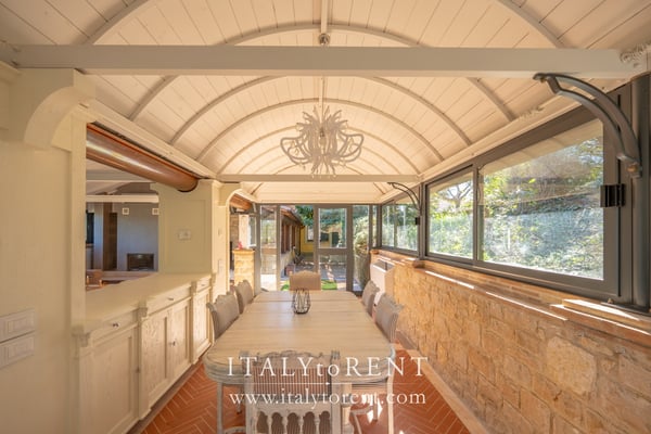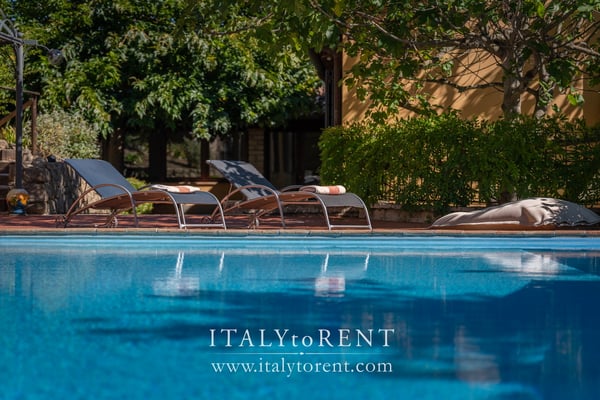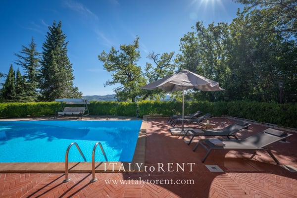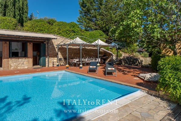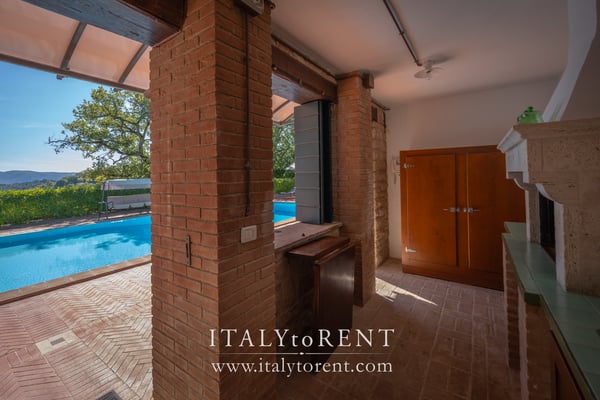 The pool area has sun-loungers, a garden swing and a large umbrella. Near the shaded area with a portico by the pool, finds place a useful outdoor kitchen with stove, pizza oven, grill, large refrigerator (for your aperitivo!).