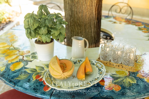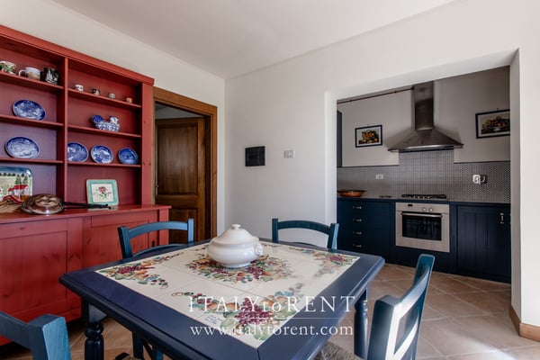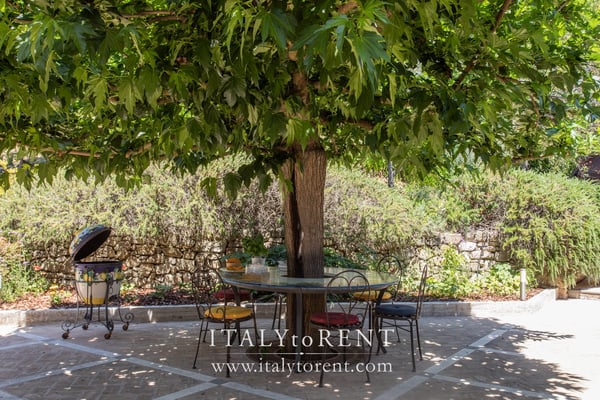 Outside dining area: long table under the pergola (can be extended, seating up to 12/14 people) and a charming ceramic table seating up to 4/6, built around the trunk of an amazing mulberry tree, that gives shade and smelling fruits.