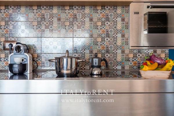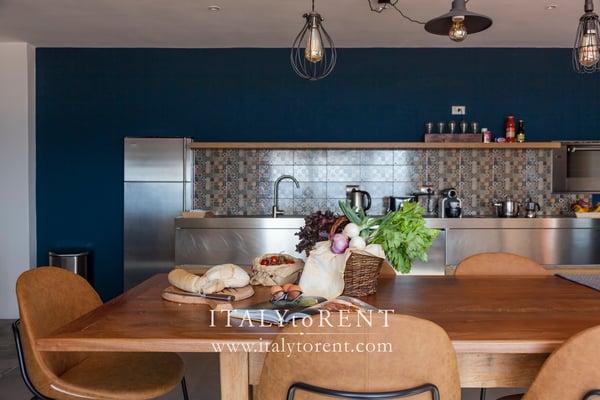 On the same floor there is a perfectly equipped kitchen in modern style, with a large dining table for wining and dining with friends. The kitchen also has direct access to the outside dining area.