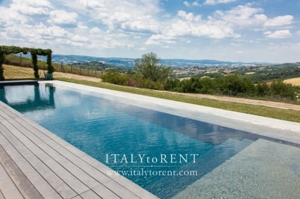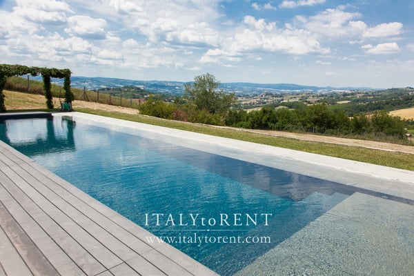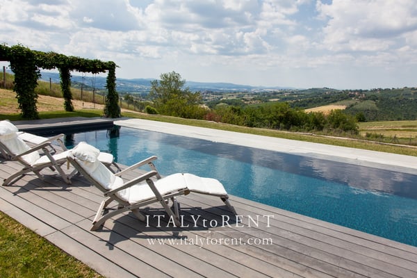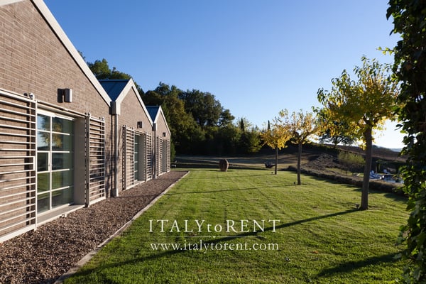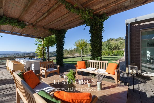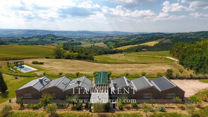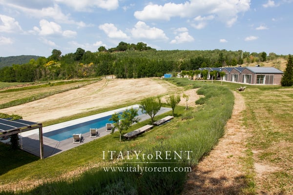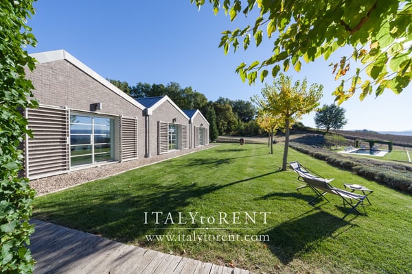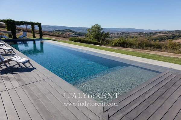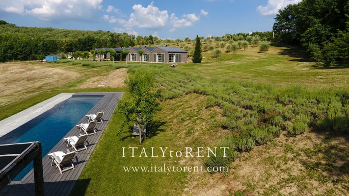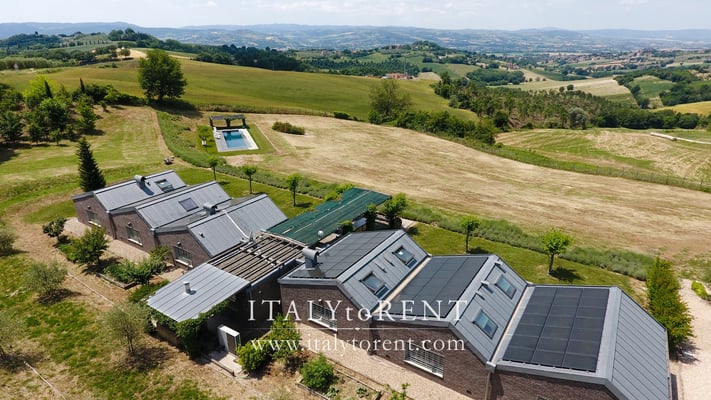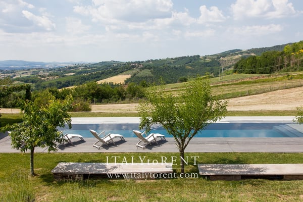 Newly built contemporary villa with beautiful garden and pool, comprising large open plan living area, 4 bedrooms and 4 bathrooms. A separated large studio apartment, with its own entrance, is located into the main residence. Villa Design is set in panoramic location 11 km from Todi and a short drive from the fist village.