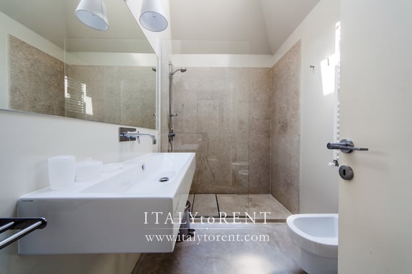 The studio comprises a living area with 2 joinable single beds that are larger than standard single beds (1 metre wide), a bathroom on the ground floor and a mezzanine with double bed, the ceiling of the mezzanine is low, with 2 skylights, one of them over the bed. The mezzanine, together with some steps to the ground floor, makes the studio not ideal for young children or people with restricted mobility, but is ideal as fourth bedroom with private bathroom, so that the property can accommodate up to 8 (+2) people. The living area of the studio is furnished with 2 single beds that are 1 metres width, larger than a standard single bed), if joined, is possible to obtain a very large double bed. The rental of the studio has an extra cost.