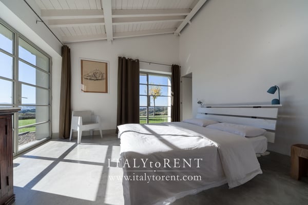 The entrance to the main house can be found alongside the pretty pergola overlooking the valley, equipped with seating area and large table for outdoor dining: inside, on the right, there is the large open-plan living area, one bright space featuring a spacious functional kitchen with island, the large bright dining area completed by the annexed sitting room with fireplace and hoe theatre. Next door there is the stunning master bedroom, with sunken bathtub, walk-in wardrobe and bathroom.