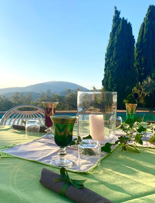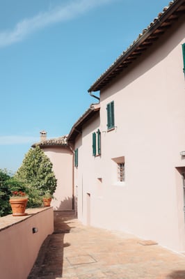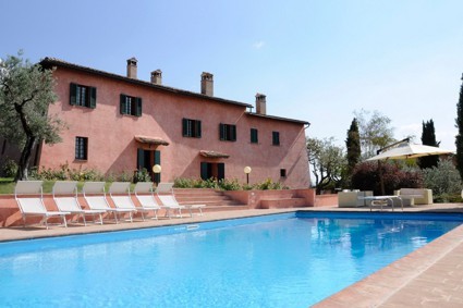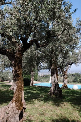 The villa, once a medieval convent, has been beautifully transformed into a charming country residence with a swimming pool, surrounded by silvery olive groves atop a scenic hill.
