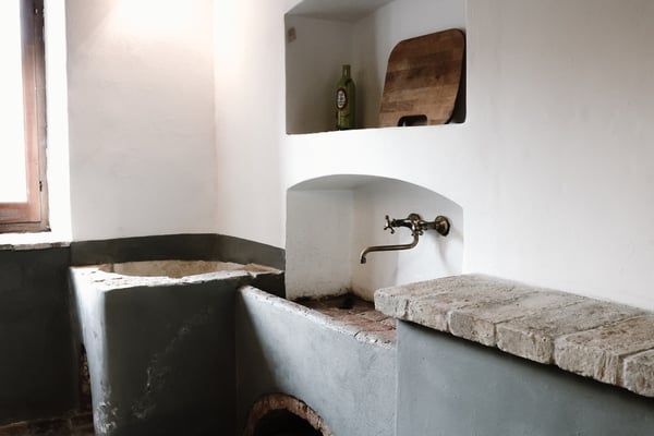 On one side lies the large, fully renovated kitchen (2020), equipped with modern, functional furnishings. From here, guests can access the former vegetable garden of the nuns, now transformed into a delightful outdoor dining area with tables for up to 20 people, a large hammock, and a barbecue. This garden area enjoys pleasant shade during the first part of the day. The kitchen also connects to the laundry and ironing room. This area is enclosed by a low wall and a fence, making it particularly safe and convenient for families with children, allowing parents to dine or relax outdoors, while keeping the children away from the pool area.