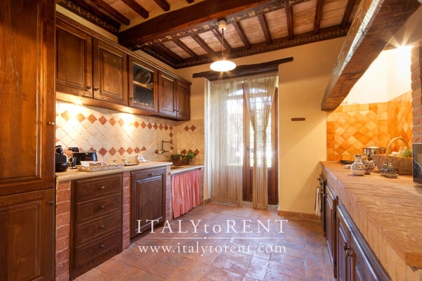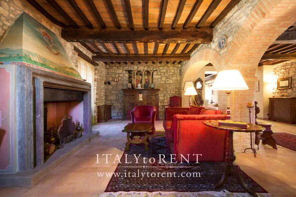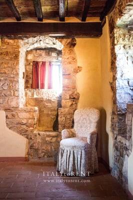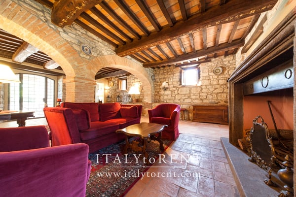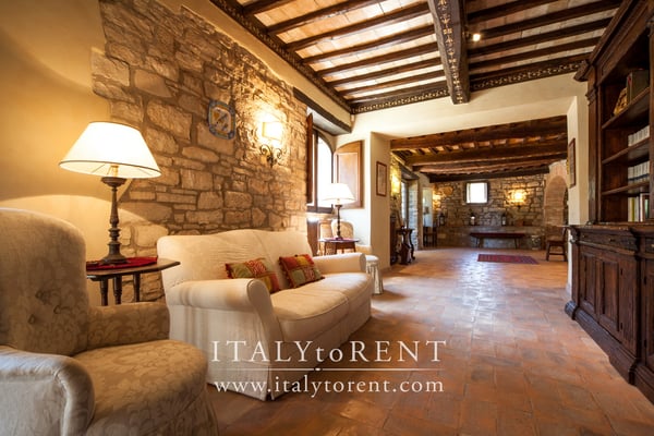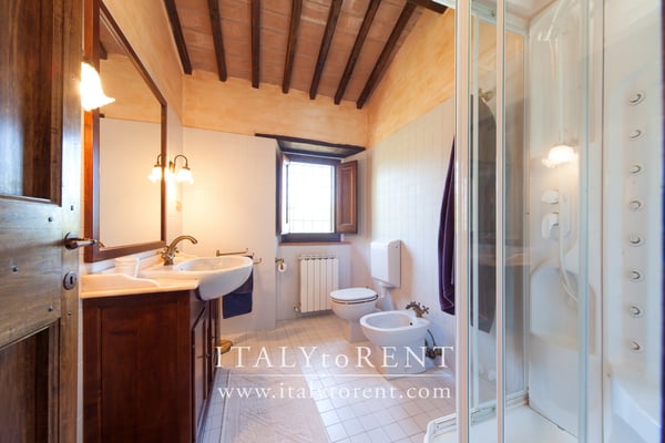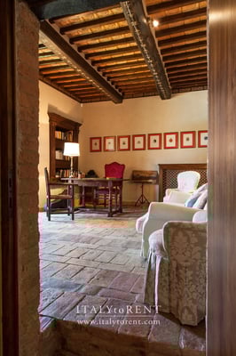 Villa a Romazzano is very spacious and elegantly furnished, predominant colors are light cream and purple red, combined with the wood color of the furniture and beams and the neutral colours of the stone walls. Decorations can be found in the wooden-beamed ceilings and the fireplace of the main living room; the study and a beautiful bedroom in the tower, have a wall entirely decorated with medieval or religious sceneries.