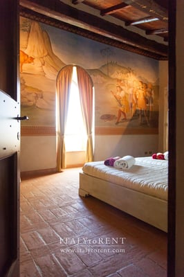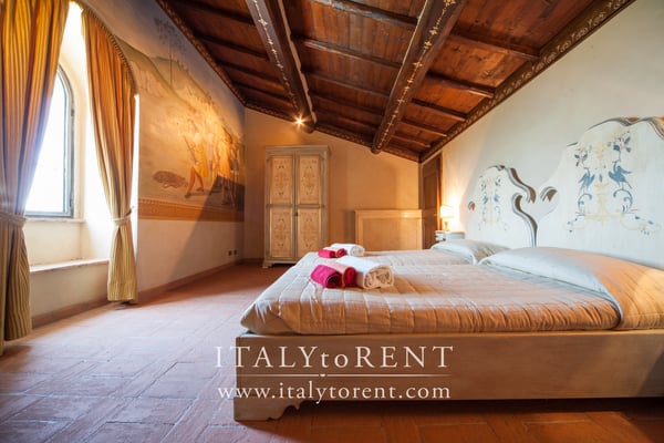 the wooden stair - 13 steps - reaches the upper and most beautiful bedroom of the villa, the gorgeous bedroom (twin beds) with painted wall, representing religious elements (copied by a church in Spoleto), en suite bathroom (Jacuzzi bathtub). The bedroom has a ceiling fan.