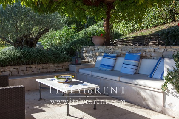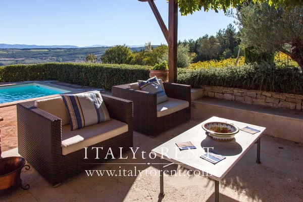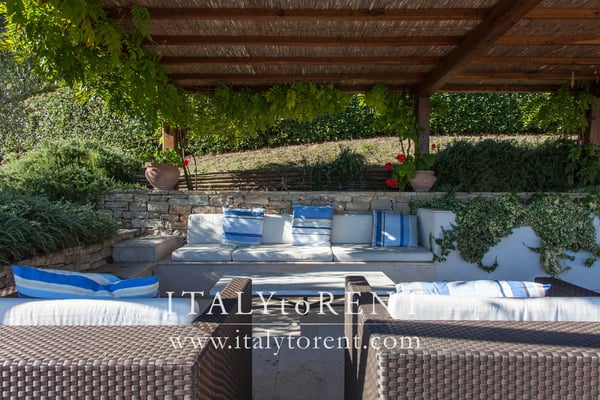 A furnished pergola is ideal for al fresco dining and to enjoy the view of Todi, relaxing in front of the pool. The main pergola features a large table complete with chairs, armchairs, a sink and a gas barbecue. Cook service on request. There is second pergola with direct access to one of the bedrooms of the ground floor, with couches and a wood oven to make pizza.