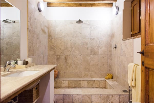 The two bathrooms downstairs are very generously sized, along with double sinks, toilet and bidet, they both feature a full height and full width walk in shower which is half the length of the bathroom itself. The whole shower is tiled with travertine marble, both the floor and the walls. The effect resembles that of a Turkish bath. Approximately the size of each shower is 2.5 by 1.5 metres, or 9 by 5 feet.