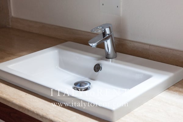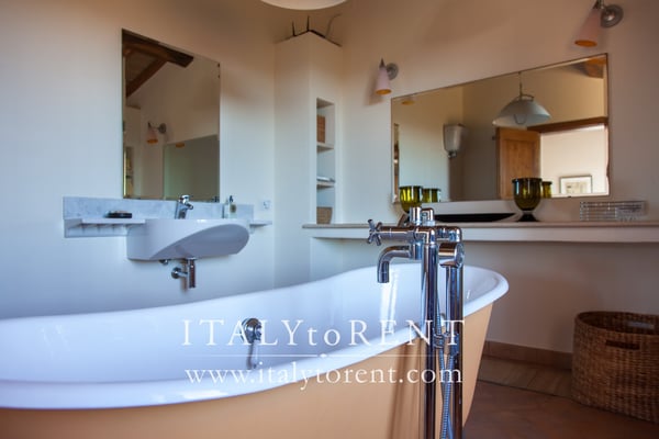 The first floor consists of an independent master suite with a large double bed. On request is possible to add a single bed. The bedroom has an en-suite bathroom featuring a stylish free-standing design bath tub with shower head. This bathroom is as large as the bedroom. The first floor also has a small study. The master suite is completed by a dressing room and has access to a spacious terrace overlooking the valley with Todi in the distance; the terrace offers total privacy and the best view of the entire villa.